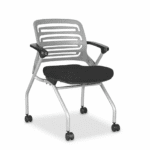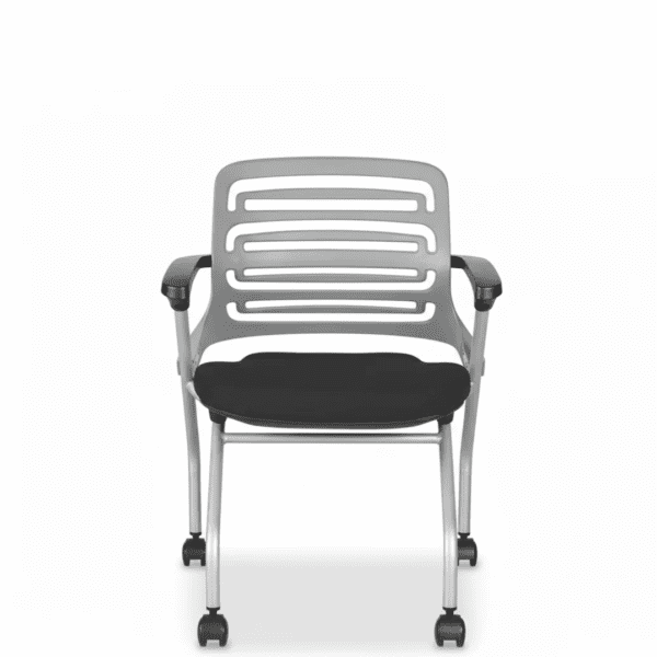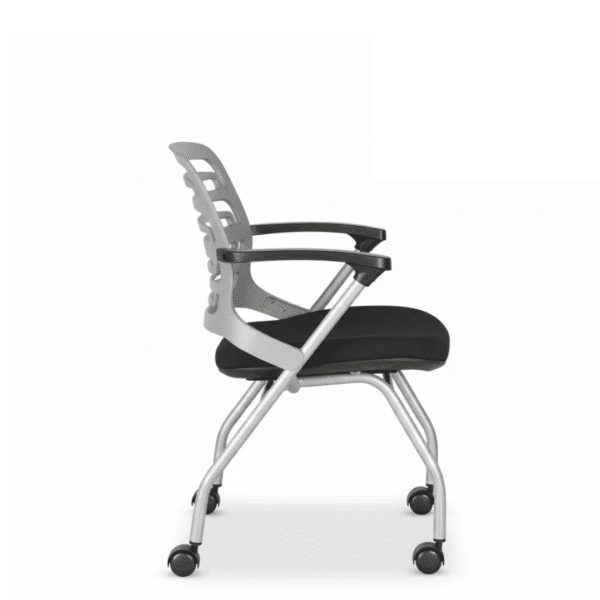 Issac Visitor solid back stacking chair, foldable seat, mild steel frame, nylon castors, armrest comfort.