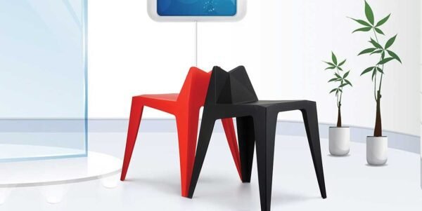 Striking orange chair featuring bold geometric lines and faceted angles, perfect for trendsetting cafes, creative workspaces, or contemporary meeting areas.