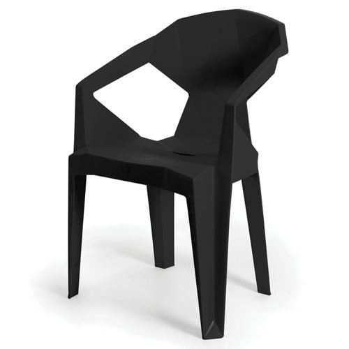 Modern black armchair with a bold geometric silhouette and faceted surfaces, designed for contemporary indoor and outdoor settings.
