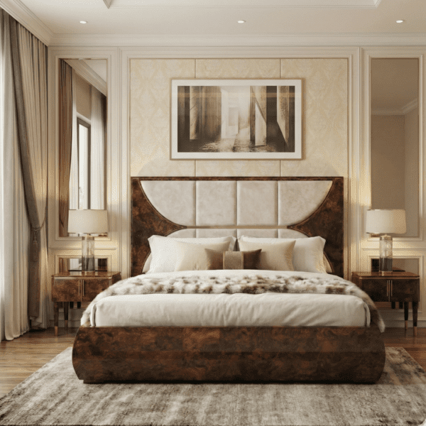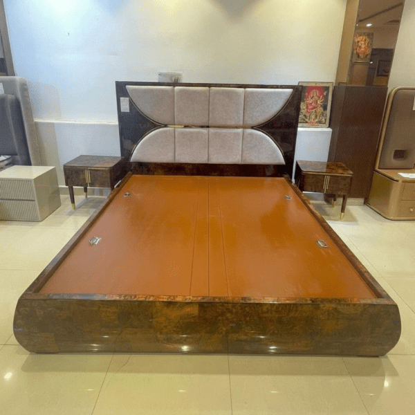 The Project Factory Modern Wooden Bed is designed for contemporary interiors that value clean lines and refined aesthetics. Featuring a unique geometric-pattern cushioned headboard with premium upholstery, this bed creates a stylish focal point in any bedroom. The strong wooden frame with a smooth polished finish ensures durability and long-term performance, while the minimalist design makes it suitable for modern homes, apartments, and premium urban interiors.