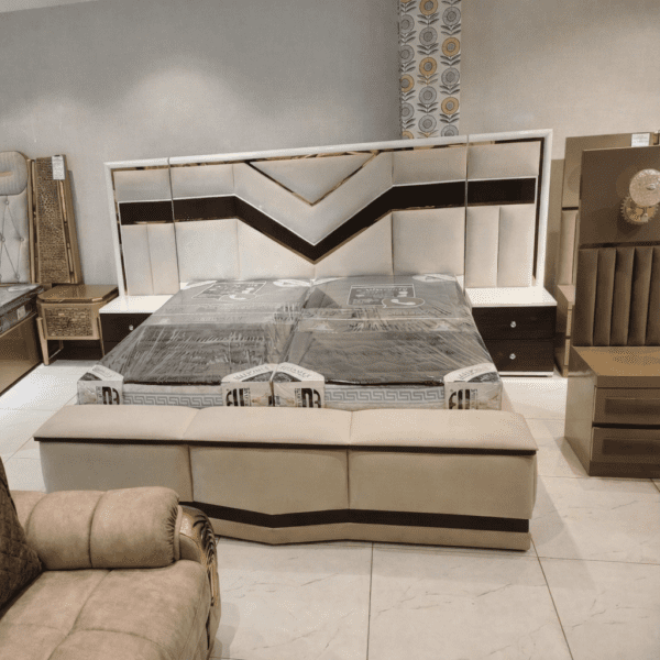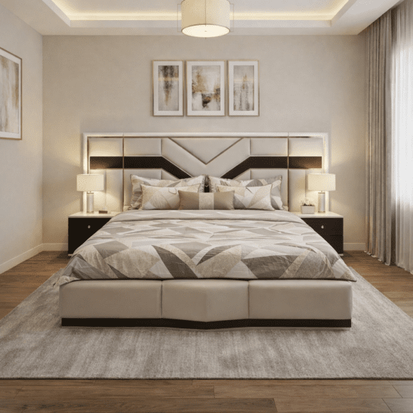 The Project Factory Luxury Upholstered Bed is a bold statement piece designed for contemporary and upscale interiors. It features a striking geometric chevron-pattern headboard with layered upholstery and contrasting accents, creating depth and visual impact. The wide padded headboard offers excellent back support, while the sturdy base construction ensures long-lasting durability. Integrated side tables enhance functionality and complete the cohesive luxury look, making this bed ideal for premium homes and high-end project installations.