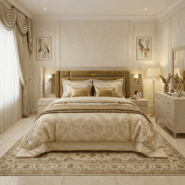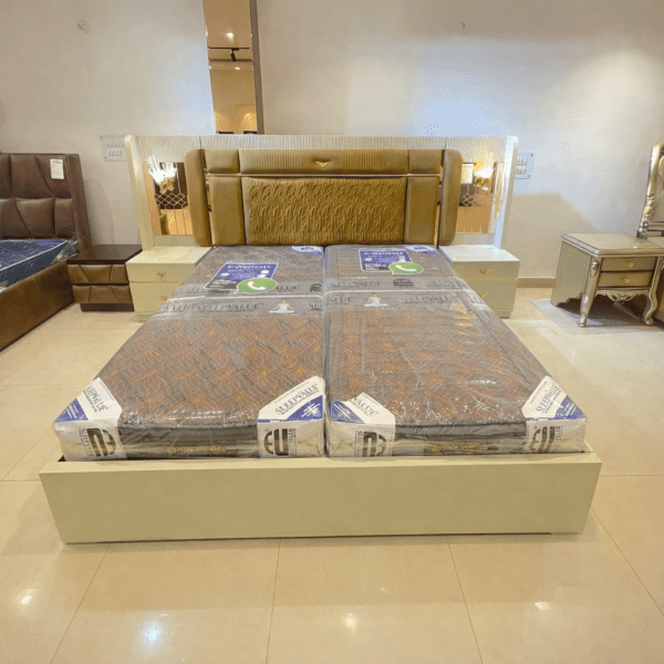 This Project Factory Luxury Designer Bed features a richly upholstered headboard enhanced with elegant mirror side panels and integrated ambient lighting. The vertically textured central upholstery adds depth and sophistication, while the soft padded structure ensures superior comfort. Finished with a sleek solid base and coordinated bedside units, this bed is designed to elevate modern luxury bedrooms, premium residences, and high-end hospitality interiors.