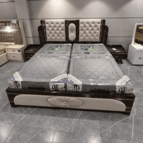 The Project Factory Premium Designer Upholstered Bed is crafted to bring luxury, comfort, and elegance into your bedroom. Featuring a beautifully padded tufted headboard with a modern dual-panel design, this bed enhances the visual appeal of any contemporary interior. The solid wooden frame with a rich dual-tone finish ensures durability and long-lasting strength, while the smooth upholstered elements add a soft and premium touch.