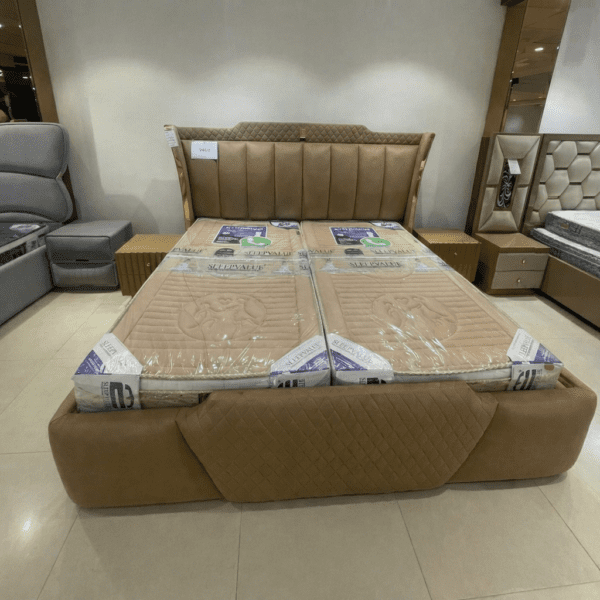 Bring warmth and elegance to your bedroom with this premium upholstered bed from Project Factory. Designed with a richly padded quilted headboard and soft fabric upholstery, this bed delivers a perfect balance of luxury and comfort. The tall headboard with vertical panel detailing enhances the visual appeal while offering excellent back support. The sturdy construction ensures durability and stability, making it suitable for homes, hotels, and large-scale project interiors. Its elegant brown tone adds a sophisticated and cozy touch to any modern bedroom setting.