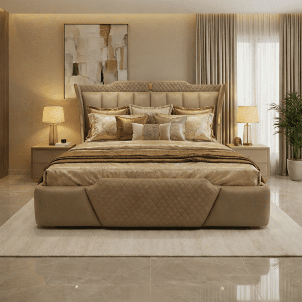 A premium upholstered bed by Project Factory, featuring a quilted padded headboard and durable frame. Designed to elevate modern bedrooms and project interiors with luxury comfort.