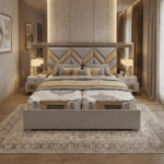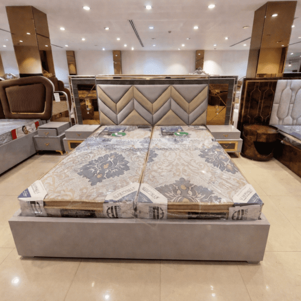 Enhance your bedroom interiors with this elegant upholstered bed from Project Factory, crafted to deliver a perfect blend of luxury and modern design. The striking chevron-pattern padded headboard adds depth and sophistication, making it a standout piece for contemporary spaces. Upholstered in premium fabric with a refined beige and grey color palette, this bed offers both visual appeal and superior comfort. Its sturdy frame ensures long-lasting durability, making it an excellent choice for modern homes, hotels, and large-scale project interiors.