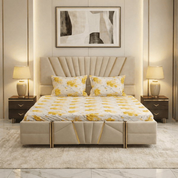 The Project Factory Luxury Upholstered Bed is crafted to deliver a premium bedroom experience with a bold and elegant design. Featuring a uniquely styled padded headboard with vertical fluted panels and golden accent detailing, this bed adds a touch of luxury and sophistication to any interior. The soft upholstery ensures comfort, while the solid frame construction provides durability and long-term stability. Perfect for modern homes, luxury apartments, hotels, and interior furnishing projects, this bed makes a strong style statement while offering everyday comfort.