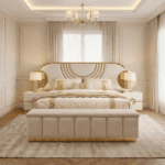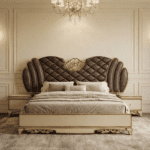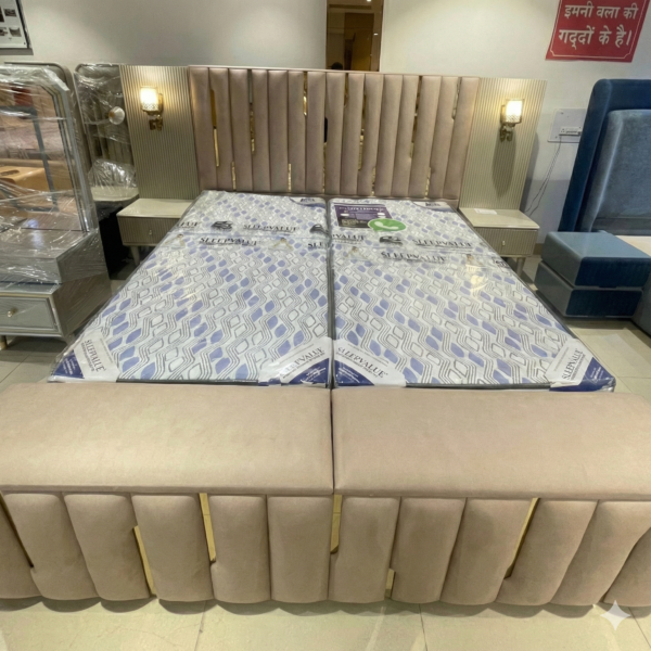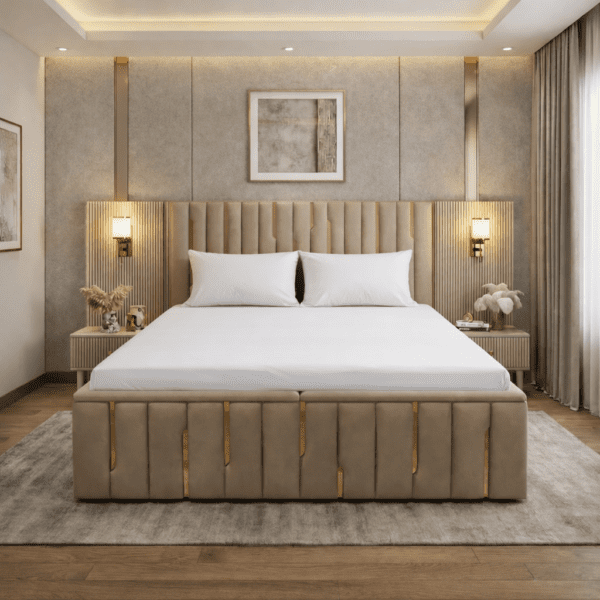 The Project Factory Luxury Upholstered Bed is designed for modern interiors that demand elegance and comfort. It features a tall, vertically channeled padded headboard with refined metallic accent strips that enhance its premium look. Integrated wall-mounted accent lights on both sides add a sophisticated hotel-style ambiance. The fully upholstered frame and cushioned footboard provide superior comfort, while the strong construction ensures durability and long-lasting support. Ideal for luxury homes, boutique hotels, and high-end interior furnishing projects.