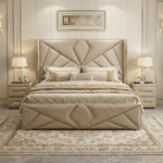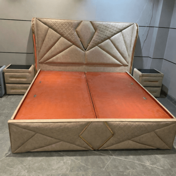 Add a bold statement of luxury to your bedroom with the Project Factory Luxury Upholstered Bed. This design features a striking geometric diamond-panel headboard with quilted detailing and elegant gold accents that enhance its premium appeal. The padded upholstery offers both comfort and sophistication, while the sturdy frame ensures long-term durability. Perfect for modern, luxury, and designer interiors, this bed combines artistic design with everyday comfort.
