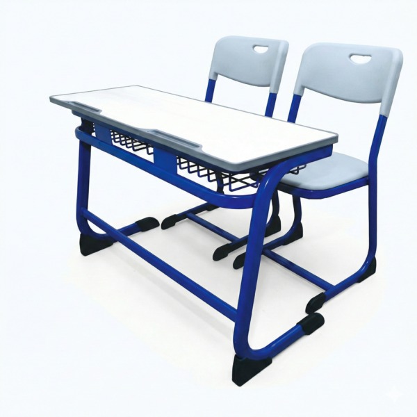 The desk is equipped with a durable laminated wooden top, providing a smooth and sturdy writing surface for daily academic use. The chairs feature ergonomically designed plastic seats and backrests, offering comfort and proper posture support during long study hours. The structure is built with a strong mild steel tubular frame, ensuring excellent stability and long-term durability.