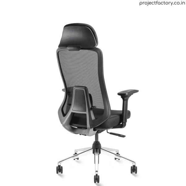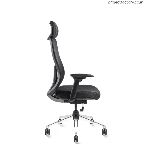 Project Factory Scott Lite Executive Chair with YUVA mesh technology, available in HB/MB variants, black finish, 4D PU armrests, 1D lumbar support, eco-friendly construction, auto weight mechanism, and crystal chrome base for premium workspace comfort.